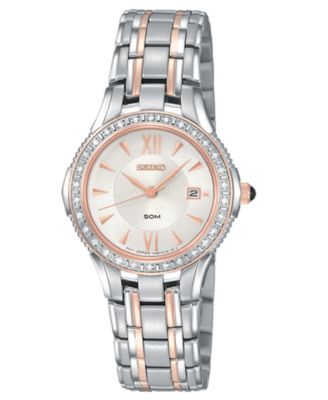 This season, dazzle her with a timely gift from Seiko. Le Grand Sport features a stainless steel round case and bracelet highlighted with rose gold accents. Textured silvertone dial with date display, logo, rose gold indexes and a sweeping second hand. Elegantly finished with a stunning 30-diamond bezel. Quartz movement. Water resistant to 50 meters. Limited three-year warranty.